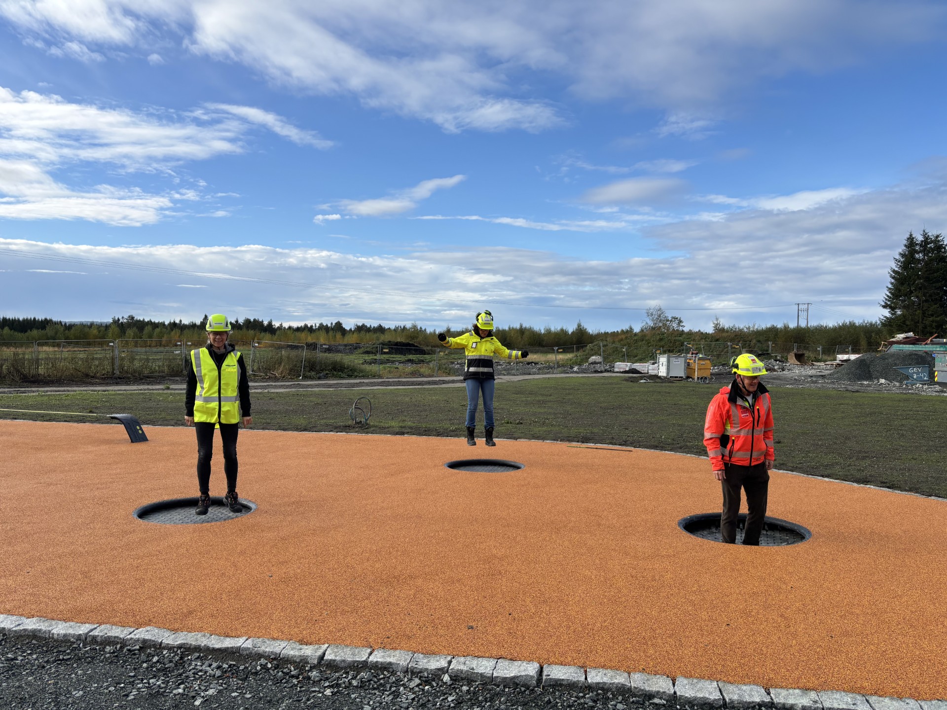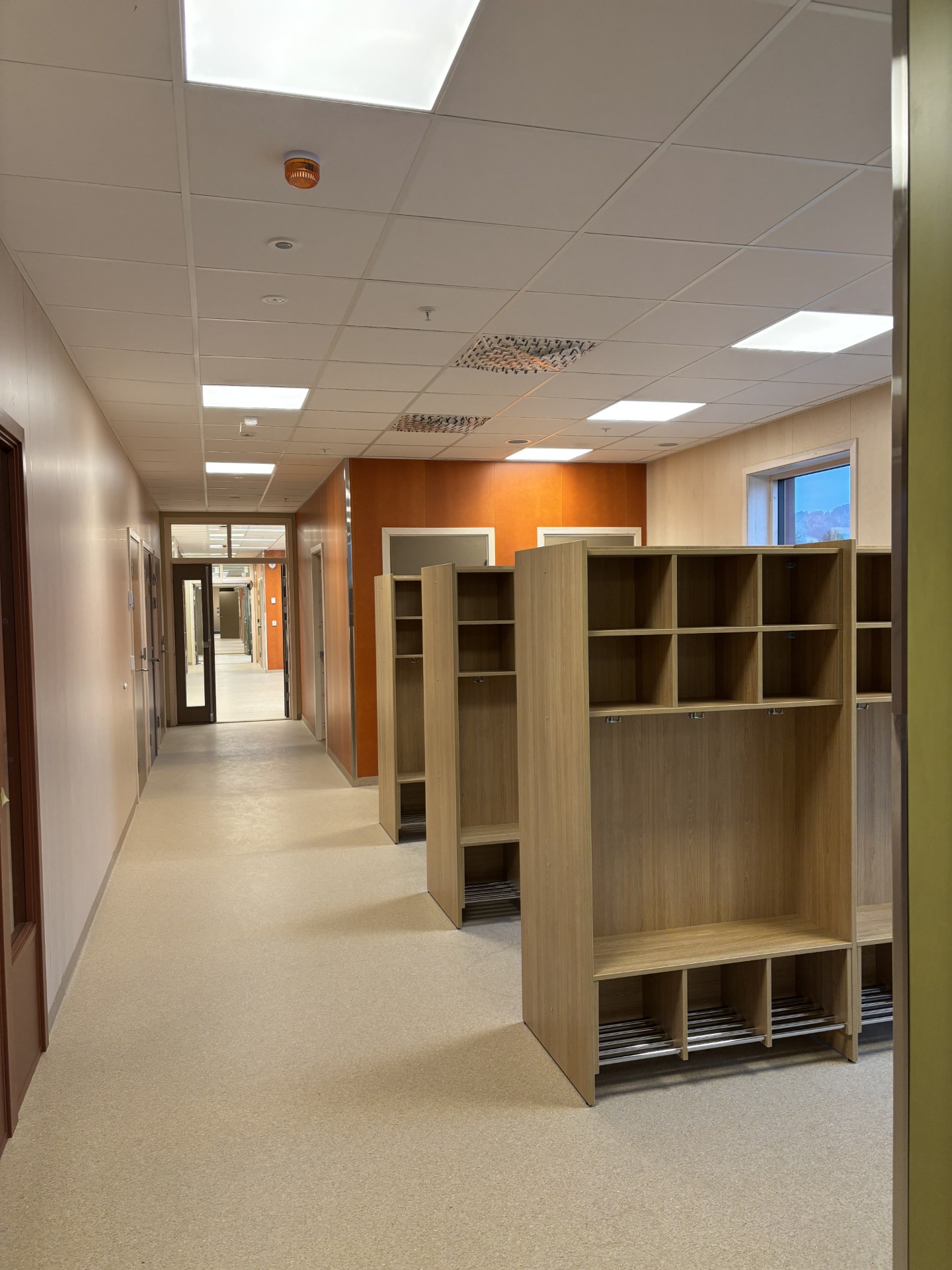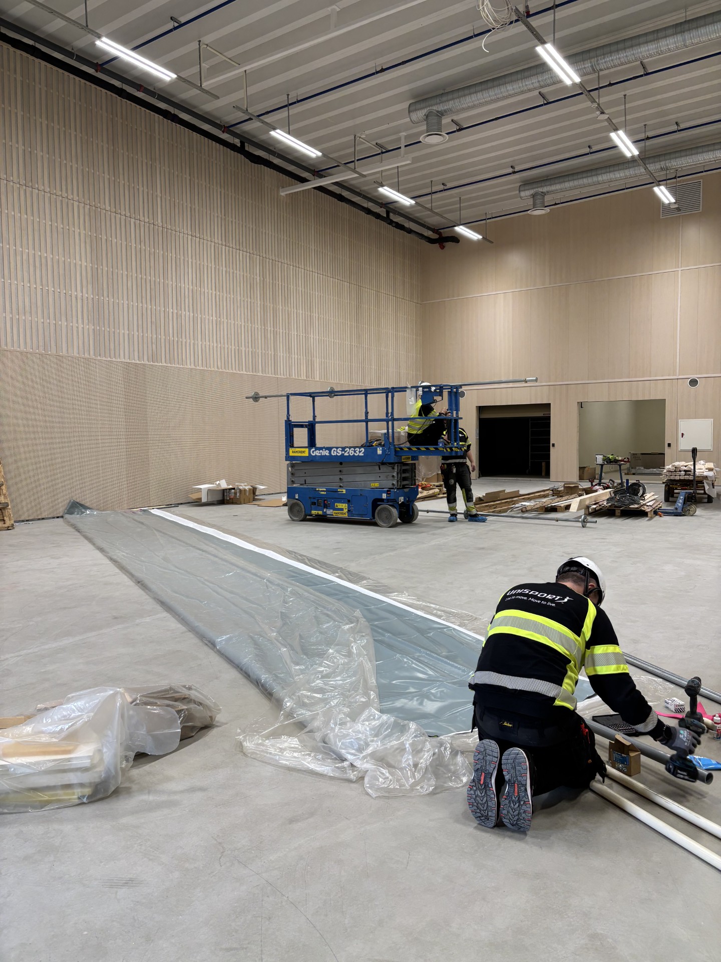 På fast inventar fronten så har Unisport hatt oppstart denne uken. Det er de som skal levere det faste inventaret i idrettshallen. De ble ferdig med nesten alt, så nå er tau, OL - ringer, skillevegg, ribbevegger og bomstasjon oppe. Er noe som står igjen, men det kommer de tilbake for å montere. Ellers har Saxvik vært her for å montere miljøstasjoner, sittebenker og andre små prosjekter de har her.
