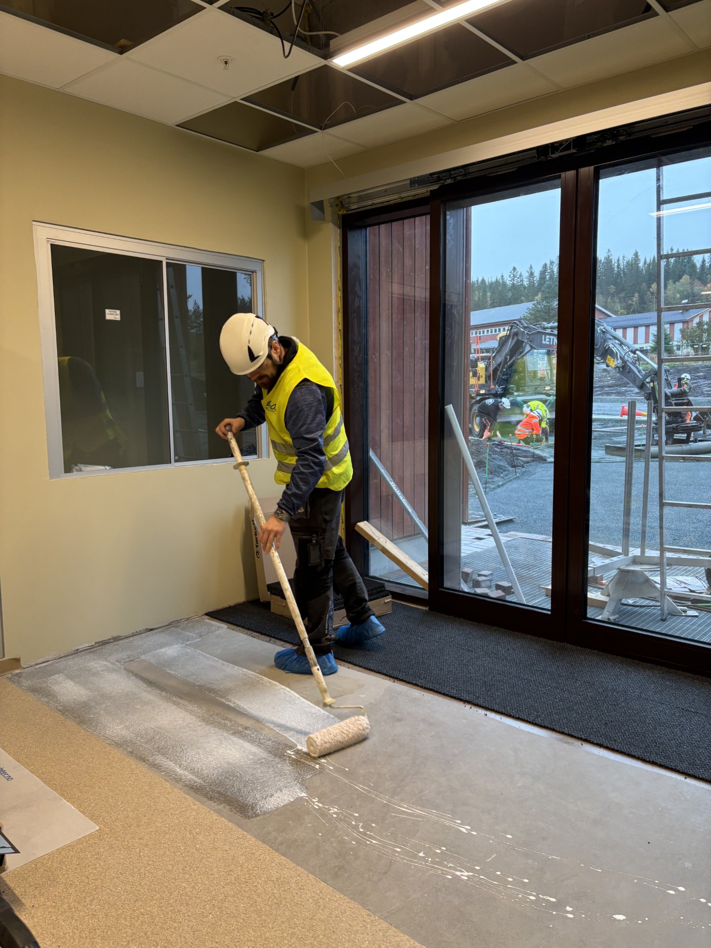 Ellers utomhus så legger Kurt Bye og Letnes stein på stein, og avretter til asfaltering neste uke. Gunnar fra ACT har montert de siste ventilene på skolen, så han begynner å nærme seg slutten på sin jobb her på Nye Stiklestad skole. E - nor kompletterer og monterer lys, de har også vært ute og koblet strøm til lysmastene som skal være på skoleområdet. S - rør jobber seg videre bortover fløyene med feridgmontering og nå jobber de med å få gulvvarmen oppe og går. Enes og Olsen har begynt sin flikk og malerunde, og de skal legge siste teppeflisen neste uke.